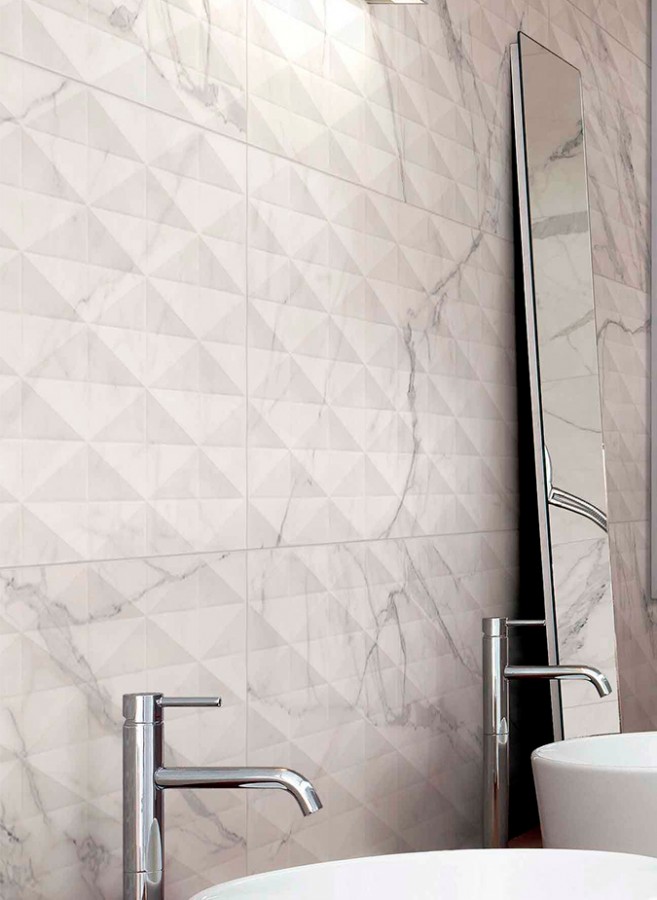 Плитка 120x40 Allmarble Wall Statuario Struttura Pave Lux 3D глянцевая белый 8мм Marazzi